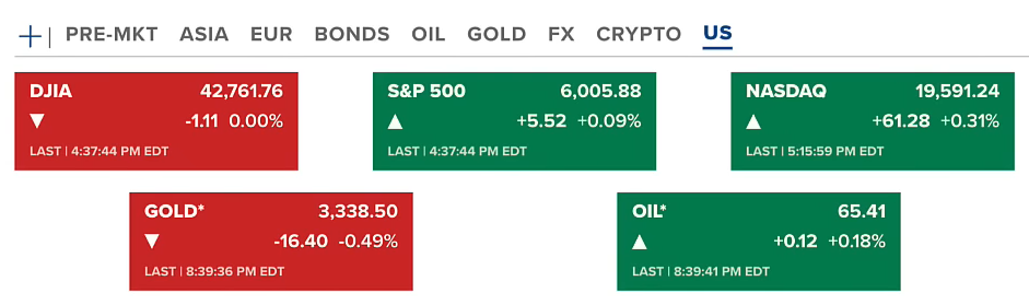 Chứng khoán Hoa Kỳ thứ hai (09/06-US) kết thúc phiên với Dow Jones đi ngang, hai chỉ số S&P 500 và Nasdaq tăng nhẹ lần lượt 0.09% và 0.31%. Hợp đồng dầu tiếp tục tăng lên 65.41 USD/thùng. Vàng giảm nhẹ về 3338 USD/ounce.