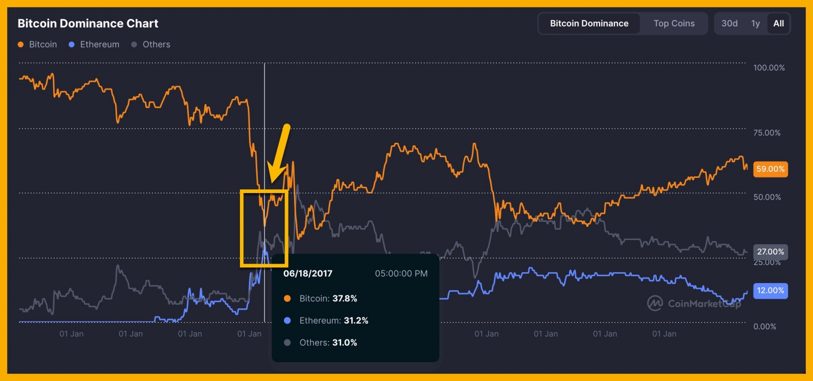 Có thể bạn chưa biết, Ethereum từng suýt vượt BTC để trở thành đồng coin có vốn hóa lớn nhất vào ngày 18/6/2017. Khi đó, BTC chiếm 37.8% thị phần còn ETH đạt 31.2%. Nhưng cuối cùng điều đó không xảy ra, BTC lấy lại thế áp đảo và giữ khoảng cách lớn với ETH cho đến nay.