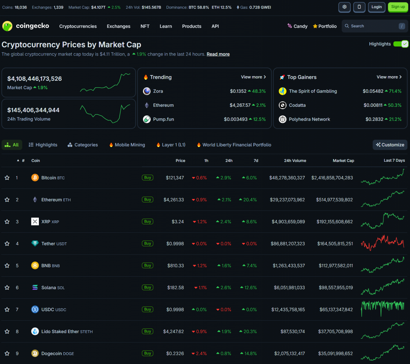 Bitcoin ngày qua đã tiến rất gần giá đỉnh và có thể phá mức giá ATH bất cứ lúc nào, có thời điểm giá BTC đã lên trên 121,000 USD. Ethereum cũng tăng trưởng mạnh lên trên 4200 USD. Vốn hóa thị trường crypto trên 4.1 nghìn tỷ USD.