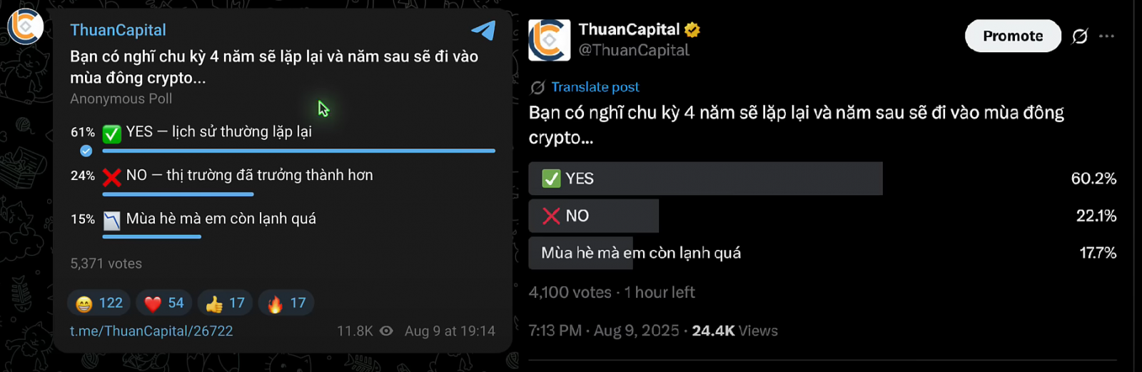 Tuy nhiên, kết quả khảo sát từ cộng đồng của Paolo Capital lại cho thấy một bức tranh khác. Trên Telegram, với hơn 5,300 người tham gia, 61% bỏ phiếu “Yes” – tin rằng lịch sử sẽ lặp lại và chu kỳ 4 năm vẫn tồn tại; 24% bỏ phiếu “No” – cho rằng chu kỳ này đã chấm dứt và 15% chỉ xem kết quả mà không bỏ phiếu.