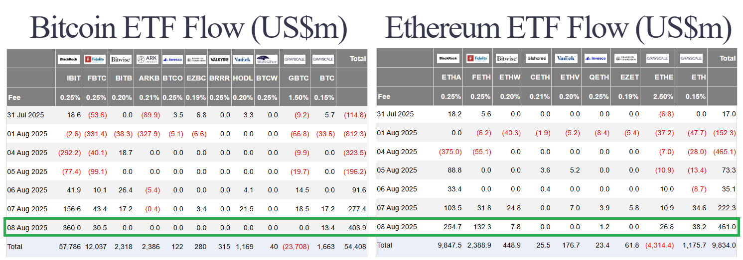 Về dòng tiền vào Ethereum thời gian gần đây đang tăng mạnh trở lại, đặc biệt là ngày thứ Sáu (08/08) vừa qua ghi nhận dòng tiền dương 421 triệu USD, lập đỉnh mới trong các quỹ ETF Ethereum tại Mỹ.