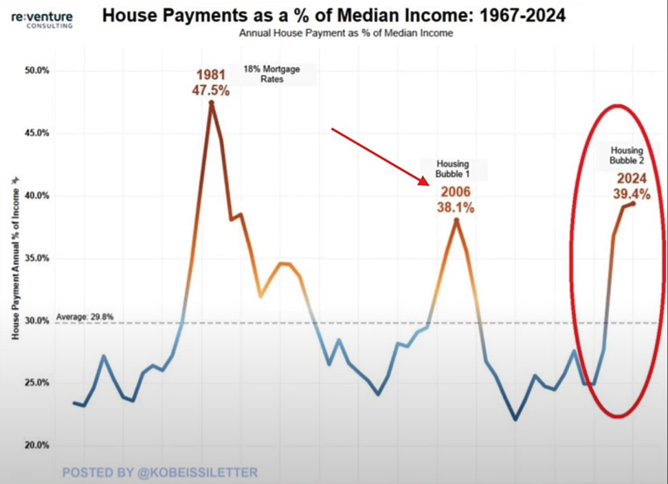Với những người mua nhà ở thời điểm này, số tiền họ phải trả hàng tháng cũng ở mức cao hơn cả thời điểm bong bóng tài chính năm 2006. Số tiền phải trả chiếm đến 39.4% thu nhập trung bình của người dân Hoa Kỳ (hình dưới).
