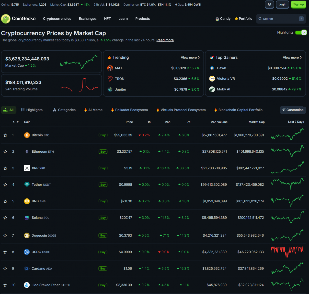Giá BTC cũng tăng và có thời điểm giá đạt 101,000 USD, sau đó trở về quanh 99,000 USD. Hầu hết altcoin lớn tăng, riêng XRP đã tăng hơn 16% lên mức 3 USD. Vốn hóa thị trường crypto tăng lên 3.628 nghìn tỷ USD.