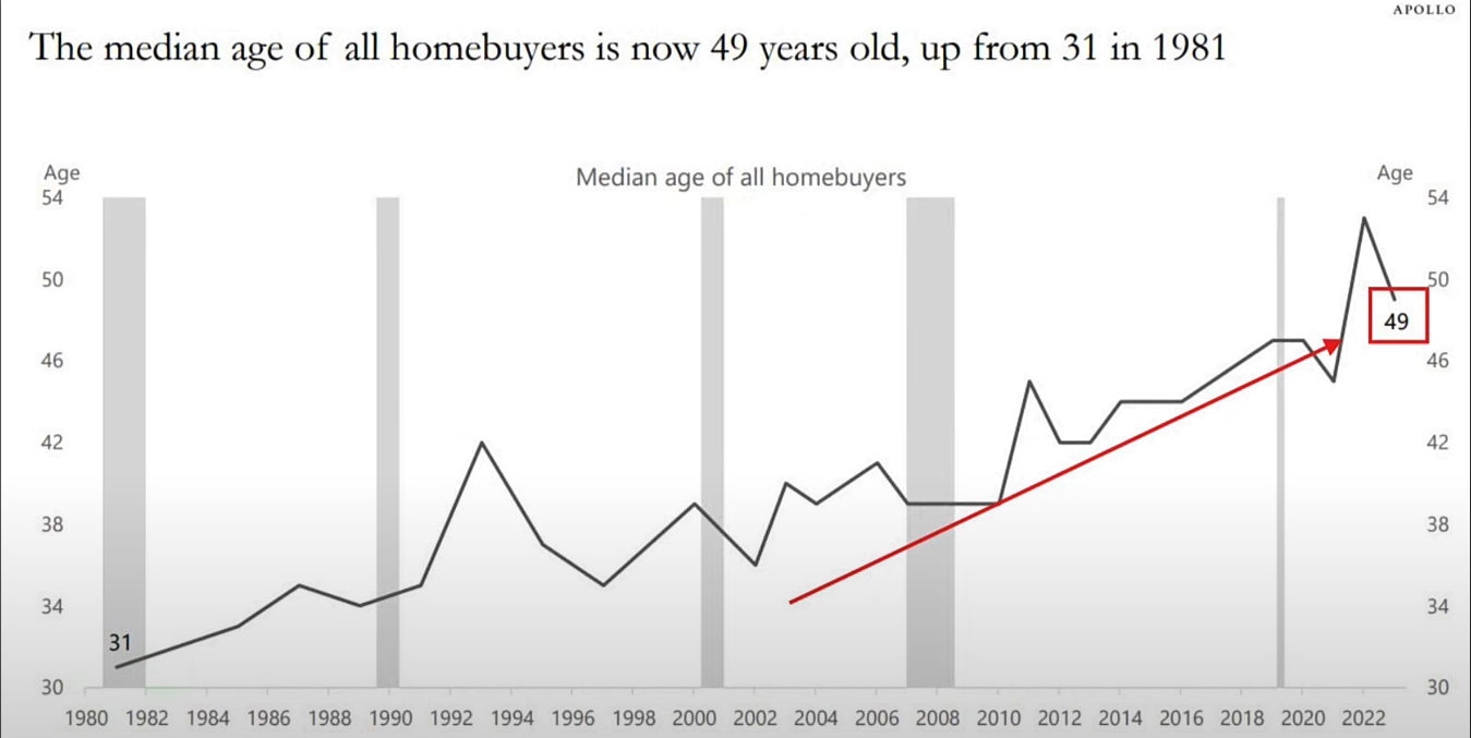 Với tình hình trên, độ tuổi trung bình để người Hoa Kỳ có thể mua được nhà cũng tăng theo thời gian. Ở thời điểm này, trung bình độ tuổi họ có thể mua được nhà ở mức 49 tuổi.