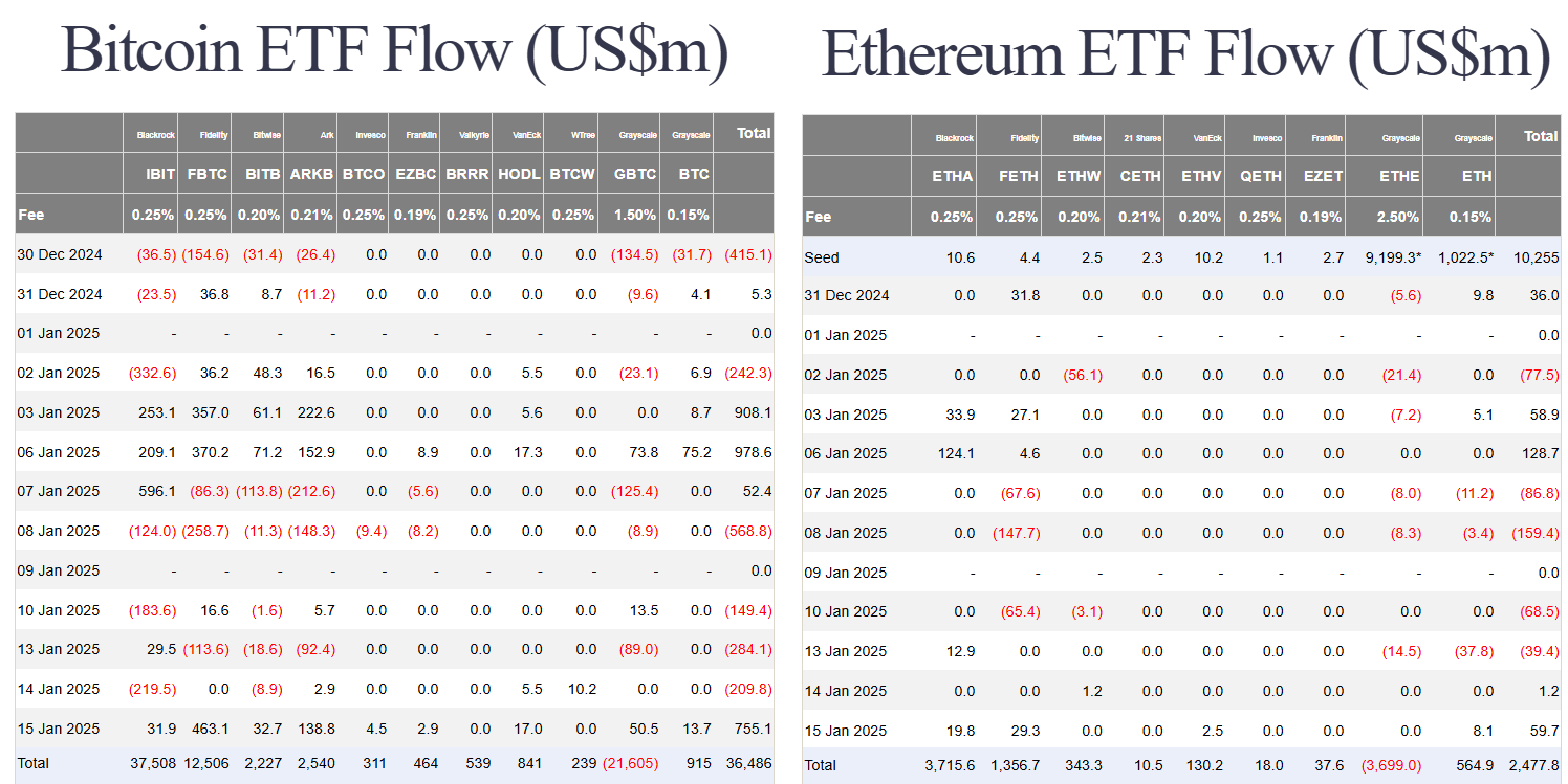 Các quỹ BTC spot ETF Hoa Kỳ đã có dòng tiền vào trở lại với tổng 755 triệu USD. Trong đó, dòng tiền vào lớn đến từ hai quỹ FBTC và ARKB. Các quỹ ETH spot ETF cũng có dòng tiền vào dương 59 triệu USD.