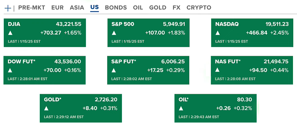 Chứng khoán Hoa Kỳ thứ tư (15/01) đều một màu xanh, cả ba chỉ số đều tăng đáng kể. Hợp đồng tương lai của chứng khoán cũng cùng xu hướng. Hợp đồng vàng và dầu đều tăng lên 2726 USD/ounce và 80 USD/thùng. Dầu cũng tăng lên mức cao trong vòng hai năm qua nhưng sự tăng trưởng này diễn ra từ từ.