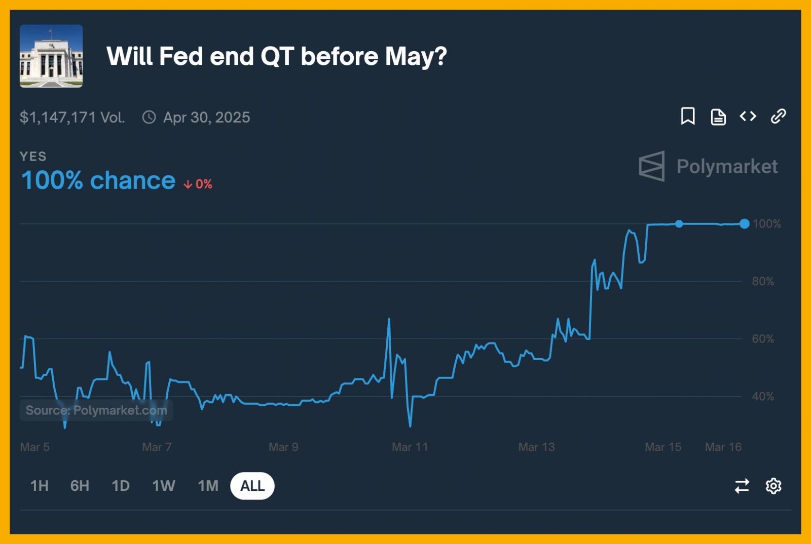 Bên cạnh đó, thị trường cũng quan tâm đến việc FED khi nào sẽ ngưng bán các tài sản của họ. Polymarket cho thấy rằng 100% đang đặt vào việc FED sẽ kết thúc Chính sách Thắt chặt Định lượng (QT). Điều này có nghĩa là FED sẽ không còn giảm lượng nắm giữ các tài sản tài chính như trái phiếu Kho bạc Mỹ và chứng khoán được bảo đảm bằng thế chấp. Kể từ khi Chính sách Thắt chặt Định lượng bắt đầu, FED đã bán ra hơn 2 nghìn tỷ USD tài sản. Việc kết thúc QT là bước đầu tiên, bước tiếp theo sẽ là Chính sách Nới lỏng Định lượng (QE), bơm thanh khoản vào thị trường.