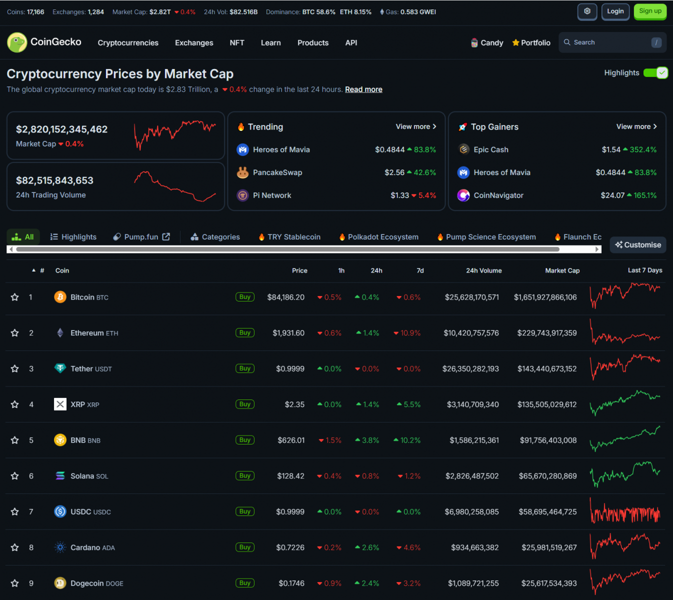 Bitcoin ngày qua quanh 84,000 USD. Một số altcoin lớn tăng nhẹ. Vốn hóa thị trường crypto là 2.82 nghìn tỷ USD.