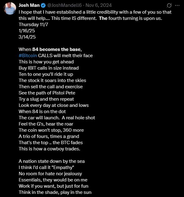 Mandell không phải là một cái tên xa lạ trong giới giao dịch crypto. Ông từng biến danh mục đầu tư từ 2.1 triệu USD lên 23.4 triệu USD, cho thấy kinh nghiệm đáng kể trên thị trường. Ông gọi giai đoạn hiện tại là “The Fourth Turning”, cho rằng nếu BTC đóng nến trong vùng 80,000 – 84,000 USD, đà tăng có thể tiếp tục, với mục tiêu 100,000 USD vào cuối tháng. Đặc biệt, nếu BTC chạm đúng 84,000 USD, Mandell tin rằng một bước nhảy vọt “lịch sử” có thể xảy ra.