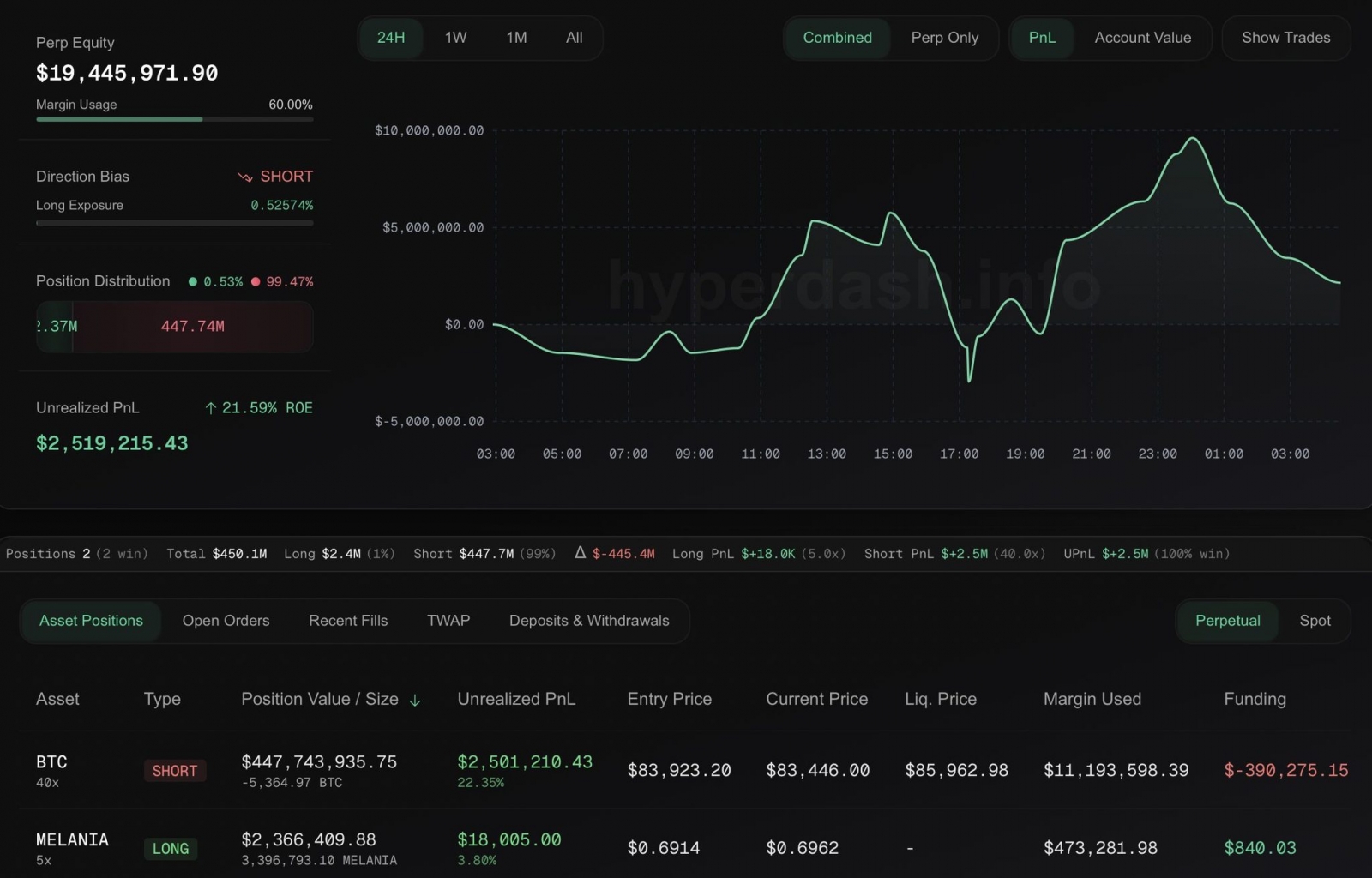 Một nhóm cá voi khác đã đẩy BTC lên 1,500 USD trong 5 phút để cố gắng thanh lý cá voi này, nhưng người này nhanh chóng nạp thêm 5 triệu USD, đẩy mức thanh lý lên 86,600 USD. Trong thời điểm đó, người này cũng đang short 40.7 triệu USD ETH với đòn bẩy 25x, mức thanh lý 2,400 USD.