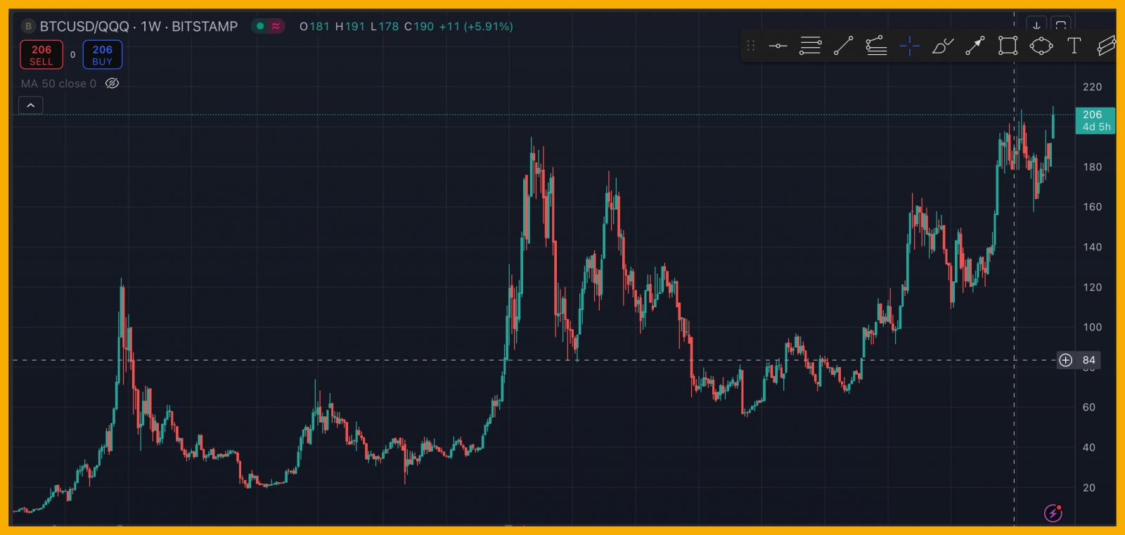Cùng với đó, Bitcoin lập đỉnh mới khi so sánh với chỉ số NASDAQ (đại diện cho các công ty công nghệ của Hoa Kỳ). Theo thời gian, tỷ lệ của BTC với chỉ số chứng khoán Nasdaq có biến động lên xuống, nhưng về dài hạn xu hướng chính là xu hướng tăng.