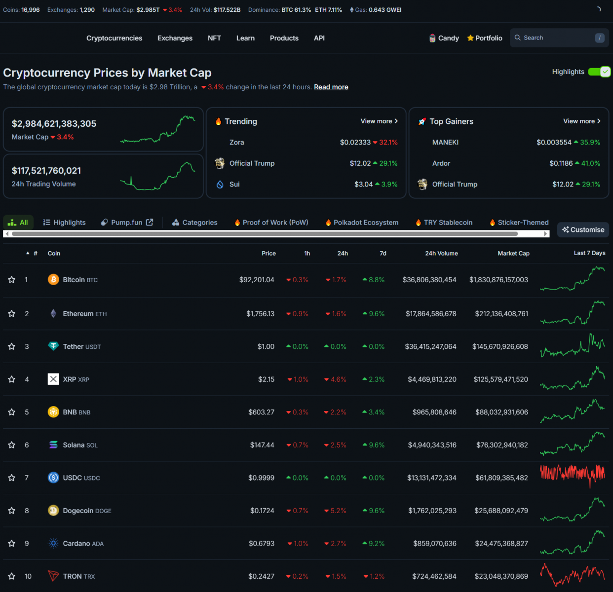 Bitcoin điều chỉnh nhẹ về quanh 92,000 USD. Hầu hết altcoin đều giảm. Vốn hóa thị trường crypto là 2.98 nghìn tỷ USD.