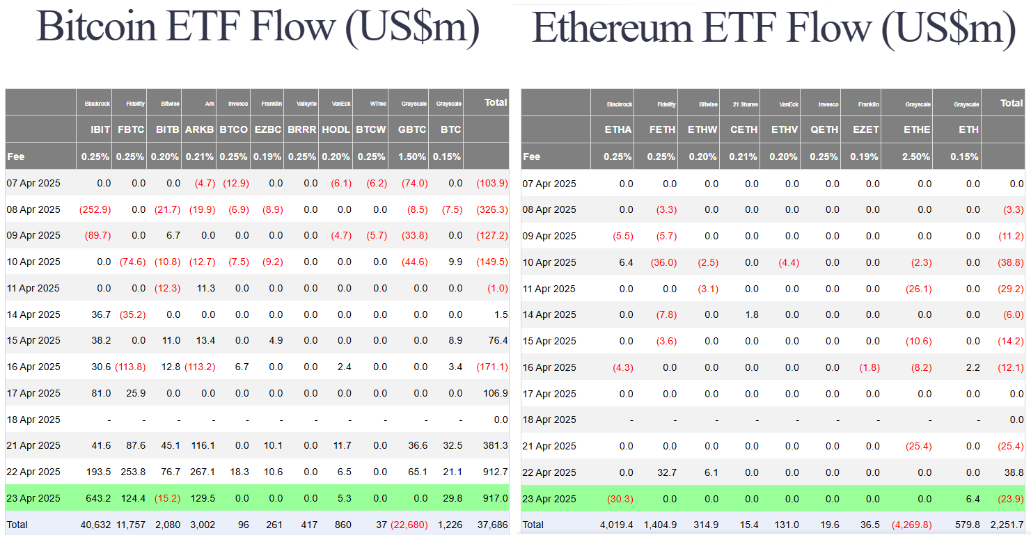 Các quỹ BTC spot ETF Hoa Kỳ thứ tư (23/04) tiếp tục có dòng tiền vào lớn với tổng 917 triệu USD. ETH spot ETF lại có dòng tiền rời khỏi là 23.9 triệu USD.