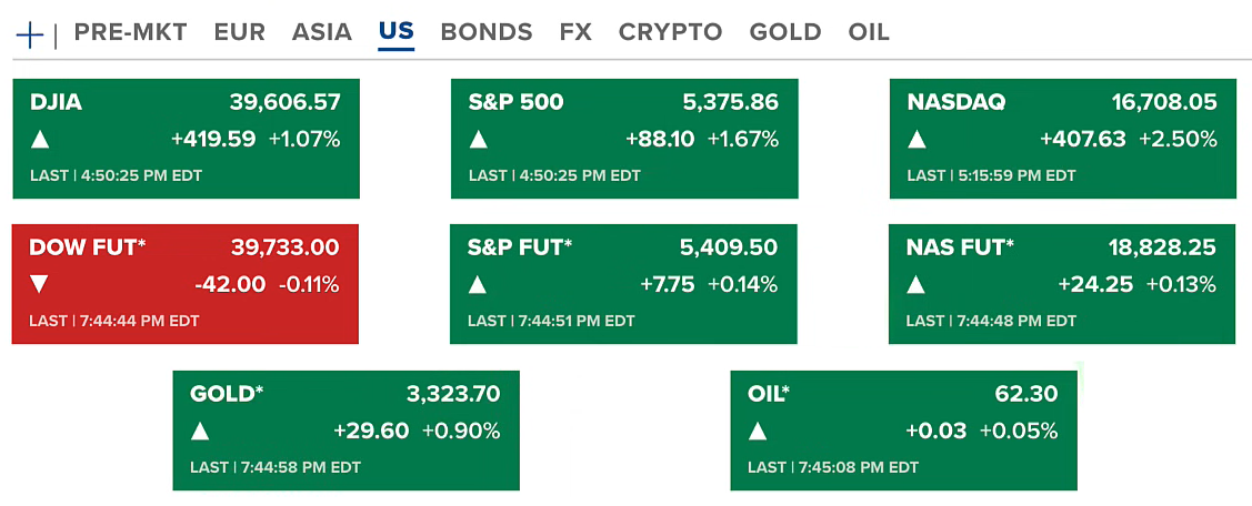 Chứng khoán Hoa Kỳ thứ tư (23/04) tiếp tục tăng ở cả ba chỉ số, Nasdaq tăng nhiều nhất 2.5%. Hợp đồng tương lai của chứng khoán có Dow FUT giảm nhẹ, hai chỉ số còn lại tăng. Dầu và vàng tăng quanh 62 USD/thùng và 3323 USD/ounce.