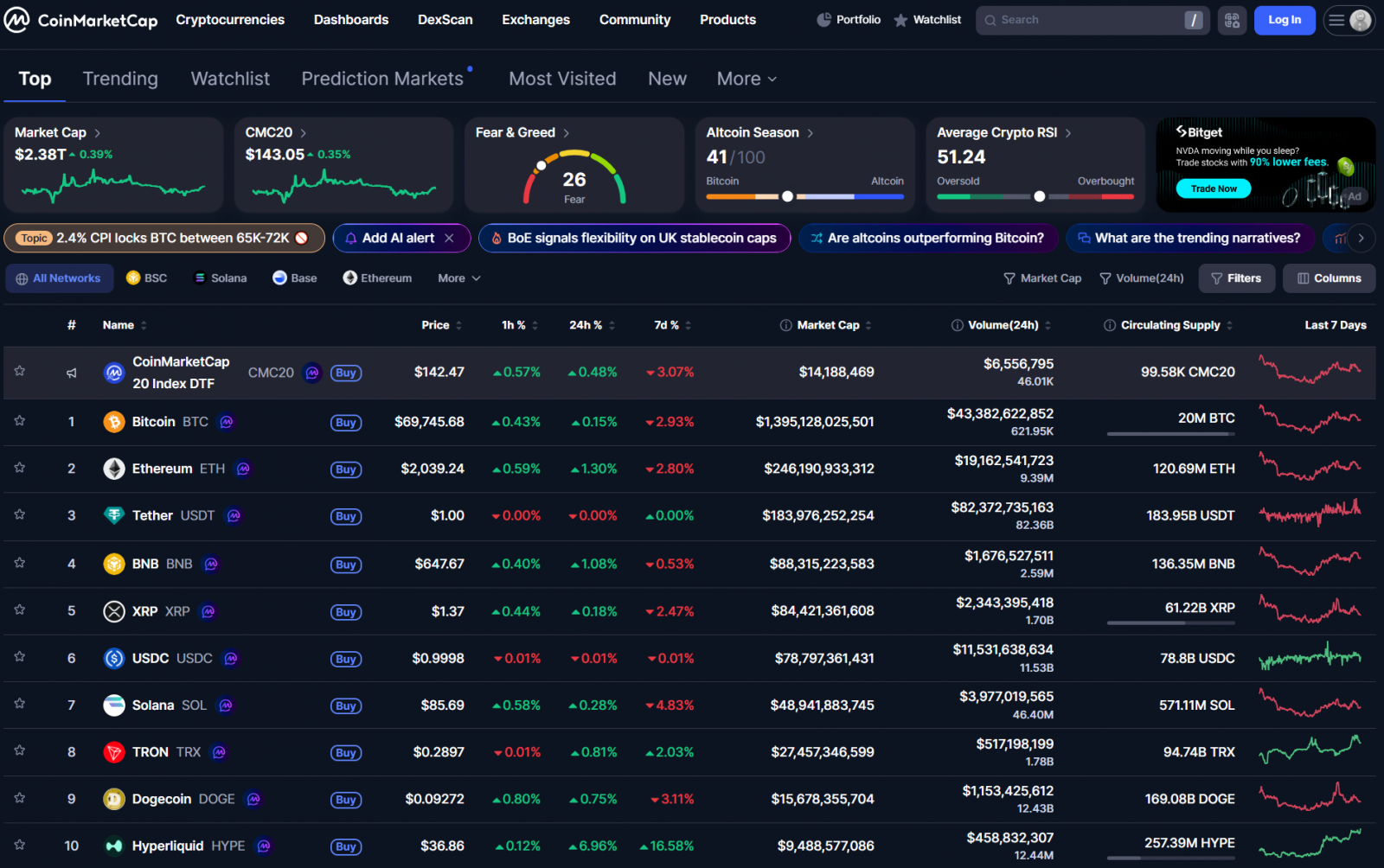 Bitcoin vẫn quanh 69,000 USD – 70,000 USD. Các altcoin lớn đa số tăng nhẹ hoặc đi ngang. Vốn hóa thị trường crypto là 2.38 nghìn tỷ USD.