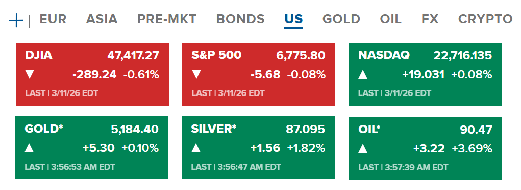 Chứng khoán Hoa Kỳ thứ tư (11/03-US) đóng phiên Dow Jones tiếp tục giảm 0.61%, còn S&P 500 và Nasdaq gần như đi ngang. Hợp đồng vàng và bạc xanh nhẹ quanh 5148 USD/ounce và 87 USD/ounce. Dầu tăng lên hơn 90 USD/thùng.