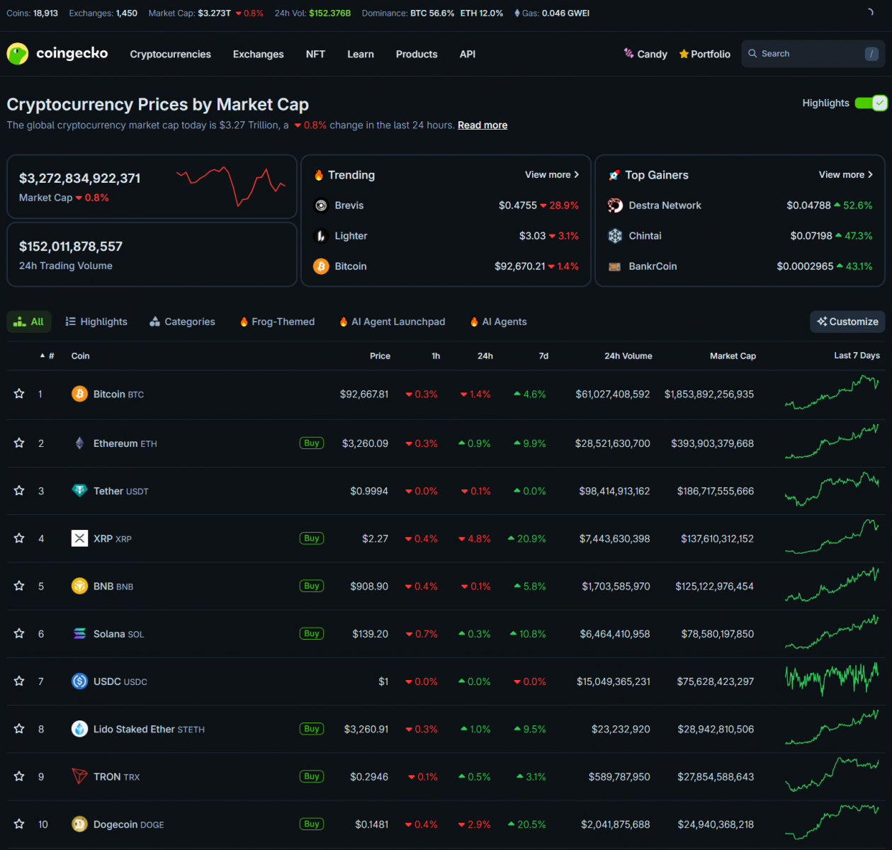 Bitcoin giảm nhẹ về quanh 92,000 USD sau nhịp tăng ngày trước đó. Các altcoin hầu hết đều điều chỉnh. Vốn hóa thị trường crypto ở mức 3.27 nghìn tỷ USD.