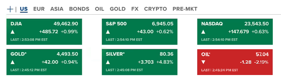 Chứng khoán Hoa Kỳ thứ ba (06/01-US) tiếp tục là một phiên tăng ở cả ba chỉ số, và Dow Jones lại là chỉ số tăng nhiều nhất 0.99%. Hợp đồng vàng tăng lên mức cao 4493 USD/ounce và bạc tăng tạo đỉnh mới quanh 80.3 USD/ounce. Dầu giảm quay về 57 USD/thùng.