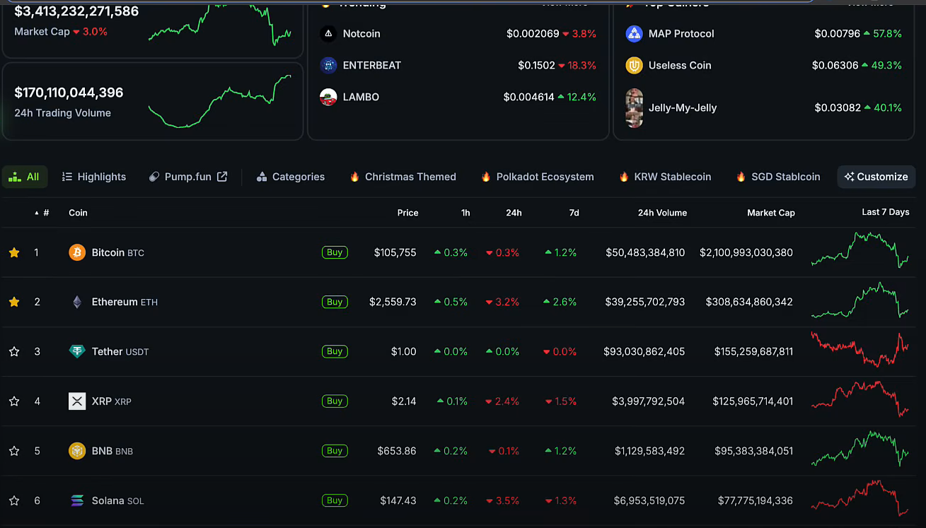 Bitcoin ngày qua hồi nhẹ lên quanh 106,000 USD. Nhiều altcoin top vẫn giảm. Vốn hóa thị trường crypto là 3.4 nghìn tỷ USD.