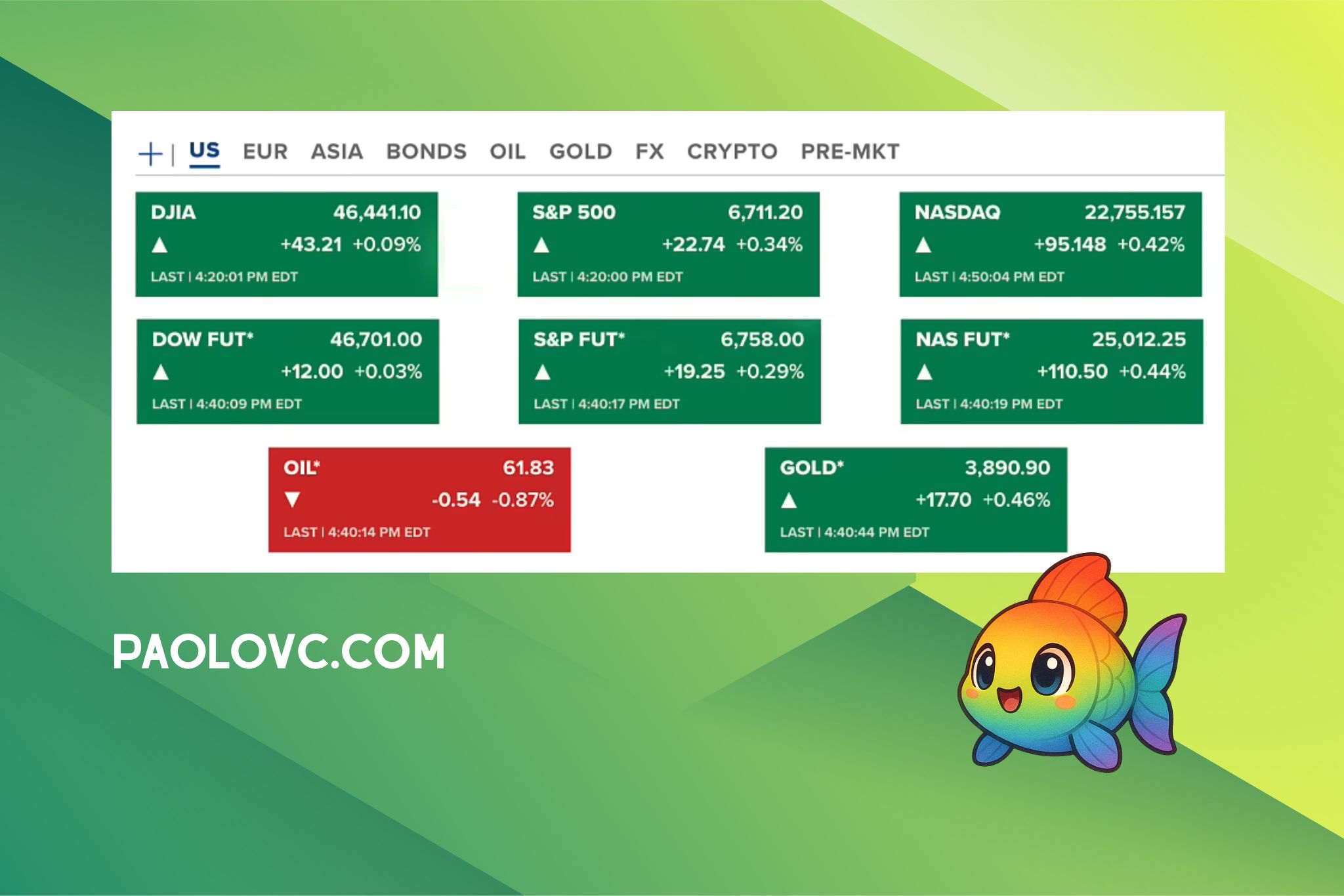 Chứng khoán tiếp tục tăng dù có tin chính phủ Hoa Kỳ đóng cửa, cả ba chỉ số đều tăng và Nasdaq tăng cao nhất 0.42% trong thứ tư (01/10-US). Hợp đồng tương lai của chứng khoán cũng tiếp tục tăng. Hợp đồng dầu giảm về 61.8 USD/thùng. Vàng tăng lên mức cao 3890 USD/ounce.