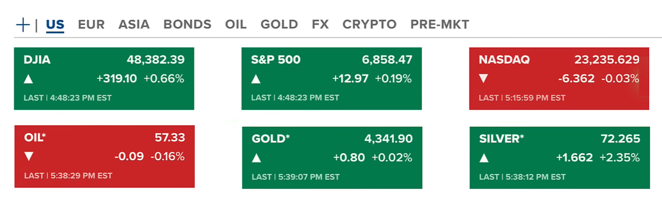 Chứng khoán Hoa Kỳ phiên giao dịch đầu năm vào thứ sáu (02/01/2026-US) kết thúc không đồng nhất với Dow Jones và S&P 500 tăng lần lượt 0.66% và 0.19%, còn Nasdaq giảm không đáng kể. Dầu giảm nhẹ vẫn quanh 57.33 USD/thùng. Vàng và bạc tăng lên quanh 4341 USD/ounce và 72.26 USD/ounce.