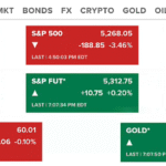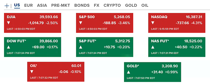 Chứng khoán Hoa Kỳ thứ năm (10/04 – US) đã giảm ở cả ba chỉ số sau phiên tăng khi tổng thống Trump thông báo hoãn thuế quan. Trong đó, Dow Jones giảm 2.5%, S&P 500 giảm 3.46%, còn Nasdaq giảm 4.31%. Hợp đồng tương lai của chứng khoán ngược lại tăng nhẹ. Dầu giảm về 60 USD/thùng. Vàng lại tăng lên 3208 USD/ounce.