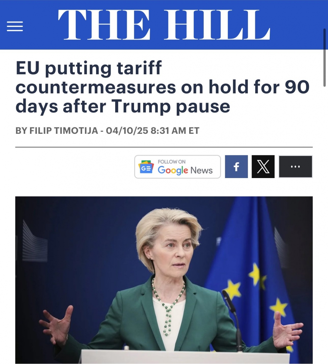 Liên minh châu Âu tạm dừng áp thuế lên hàng hóa Mỹ trong 90 ngày, đồng ý đàm phán một thỏa thuận thương mại mới.