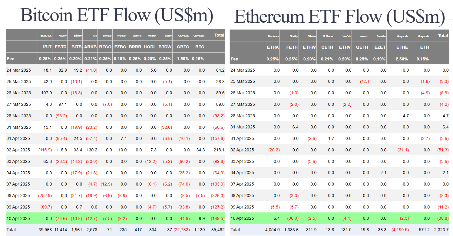 Các quỹ BTC spot ETF Hoa Kỳ tiếp tục có dòng tiền ra 149.5 triệu USD trong phiên giao dịch thứ năm (10/04 – US). Cùng xu hướng, ETH spot ETF cũng có dòng tiền rời khỏi với con số 38.8 triệu USD.
