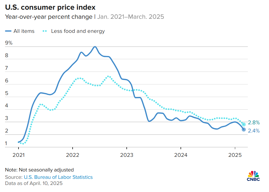 Tin được thị trường chờ đợi là CPI cũng đã được ông bố trong thứ năm. Trong tháng 3, chỉ số giá tiêu dùng (CPI) của Mỹ giảm 0.1%, kéo lạm phát hàng năm xuống còn 2.4%, thấp hơn mức 2.8% của tháng 2 và dự báo 2.6% của Phố Wall. Lạm phát lõi Core CPI (không tính thực phẩm và năng lượng) tăng nhẹ 0.1% trong tháng, đạt 2.8% – mức thấp nhất kể từ tháng 3/2021. Con số này thấp hơn con số 3.0% ước tính và mức 3.1% của tháng trước đó.