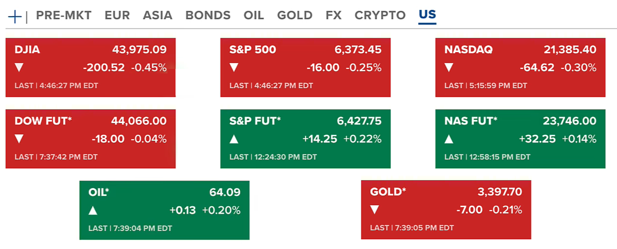 Chứng khoán Hoa Kỳ thứ hai (11/08-US) kết thúc phiên đầu tuần cả ba chỉ số đều giảm, với Dow Jones giảm nhiều nhất 0.45%. Hợp đồng tương lai của chứng khoán nghiêng về xu hướng tăng. Dầu tăng nhẹ lên 64 USD/thùng. Vàng quanh 3397 USD/ounce.