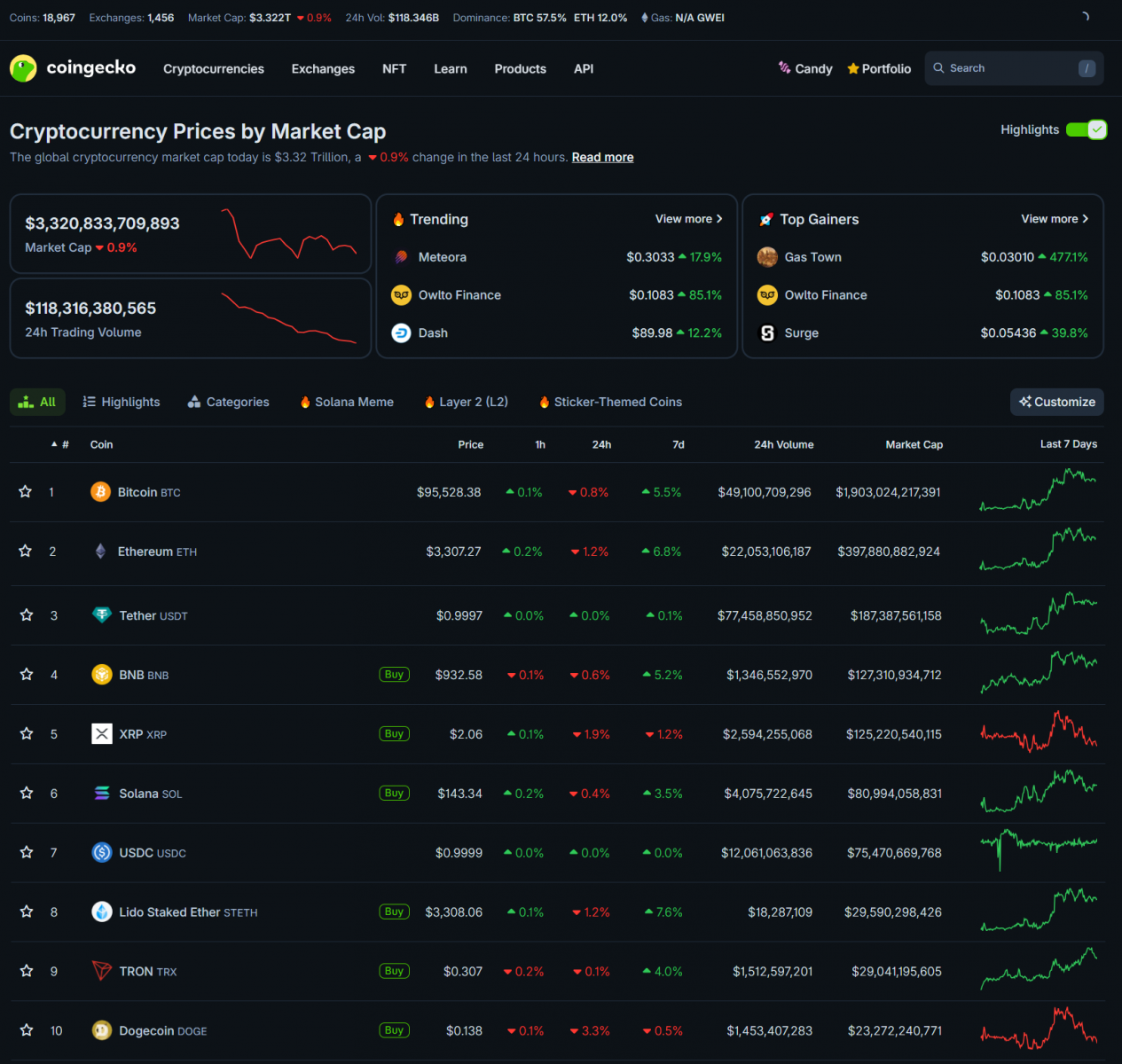 Bitcoin giảm nhẹ về quanh 95,000 USD. Các altcoin lớn cũng điều chỉnh cùng xu hướng. Vốn hóa thị trường crypto quanh 3.32 nghìn tỷ USD.