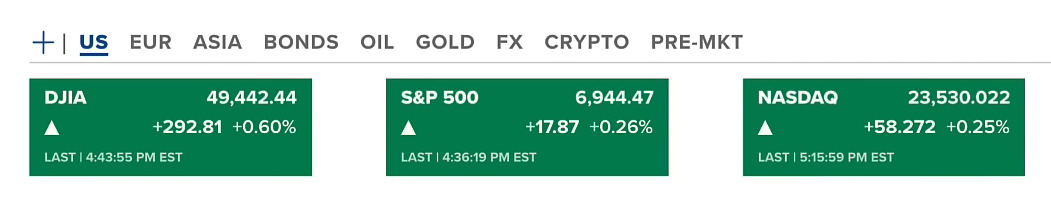 Chứng khoán Mỹ kết thúc phiên giao dịch thứ năm (15/01-US) tăng nhẹ ở cả ba chỉ số, trong đó Dow Jones tăng nhiều nhất 0.6%. Vàng và bạc đã tăng lên mức cao lần lượt 4623 USD/ounce và 92 USD/ounce trong ngày qua. Dầu thì giảm nhẹ về quanh 59 USD/thùng.