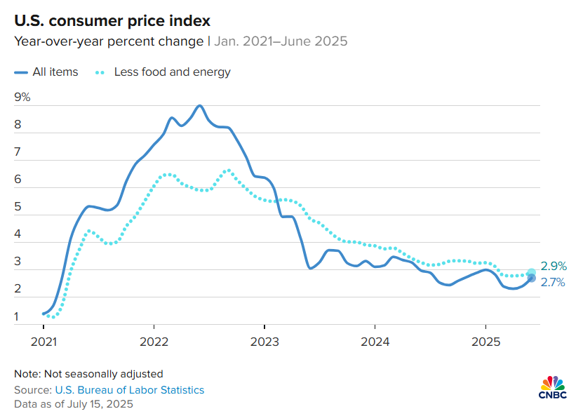 Chỉ số giá tiêu dùng (CPI) của Mỹ trong tháng này đạt 2.7%, đúng với mức dự báo và tăng nhẹ so với kỳ trước là 2.4%. CPI lõi (Core CPI), loại trừ giá thực phẩm và năng lượng, ghi nhận ở mức 2.9%, thấp hơn một chút so với kỳ vọng 3.0%, nhưng vẫn cao hơn mức 2.8% của kỳ trước. Nhìn chi tiết, đa số các nhóm hàng hóa đều tăng nhẹ và điều này sẽ khó để FED điều chỉnh. FED Watch cho thấy thị trường nghĩ khả năng FED giảm lãi suất trong tháng 7 càng thấp hơn nữa và khả năng cao hơn nghiêng về giữ nguyên lãi suất.