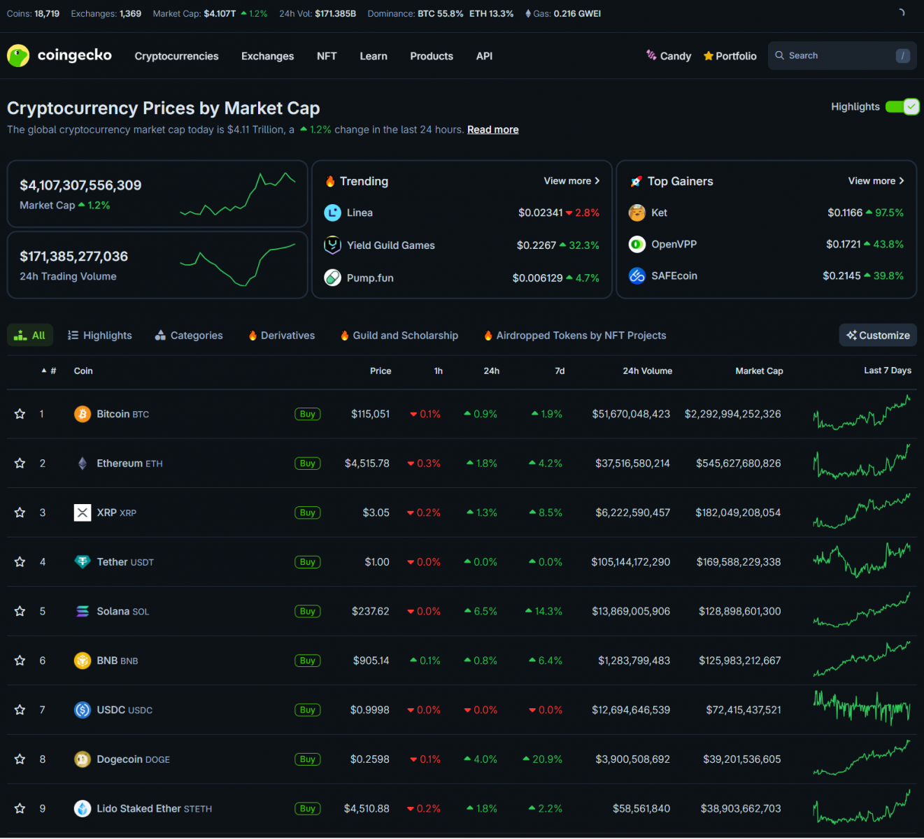 Bitcoin đã từng đạt mức 115,000 USD, kéo theo sự tăng của hầu hết các loại altcoin. Tổng vốn hóa thị trường tiền điện tử cũng đã vượt mốc 4.1 nghìn tỷ USD.