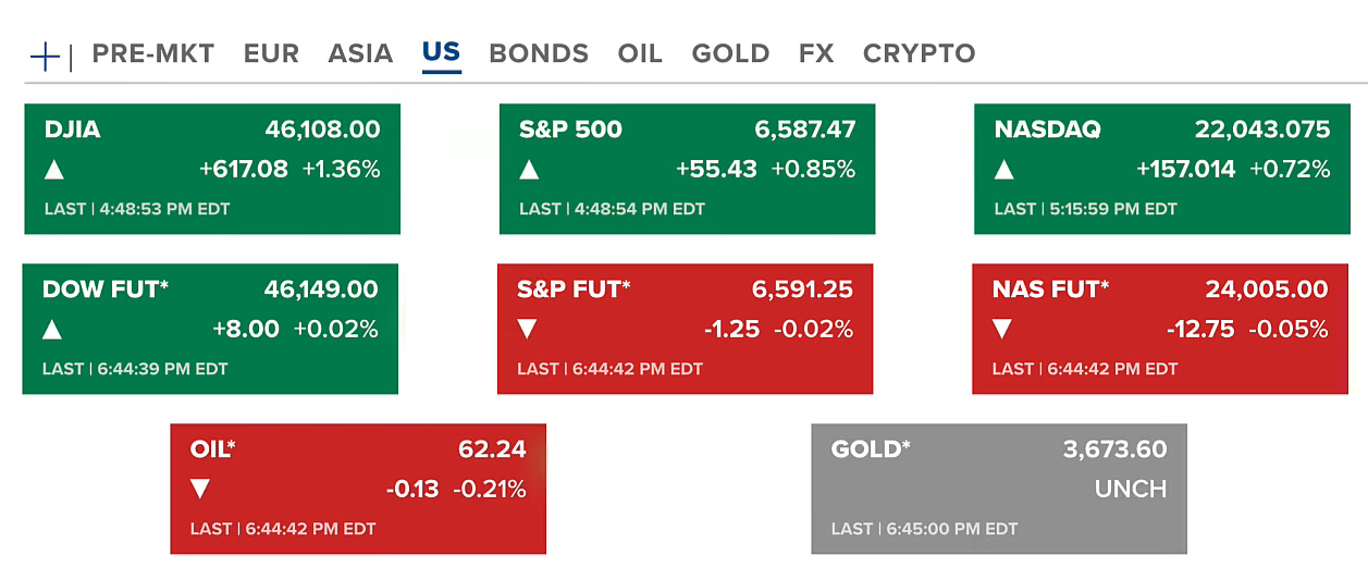 Trên thị trường chứng khoán Mỹ hôm qua (ngày 11/09), cả ba chỉ số đều tăng, với Dow Jones tăng mạnh nhất 1.36% và S&P 500 tiếp tục lập đỉnh mới. Trong khi đó, thị trường hợp đồng tương lai chứng khoán diễn biến ổn định. Giá hợp đồng dầu giảm nhẹ xuống 62.2 USD/thùng, trong khi giá vàng vẫn duy trì ở mức cao 3673 USD/ounce.