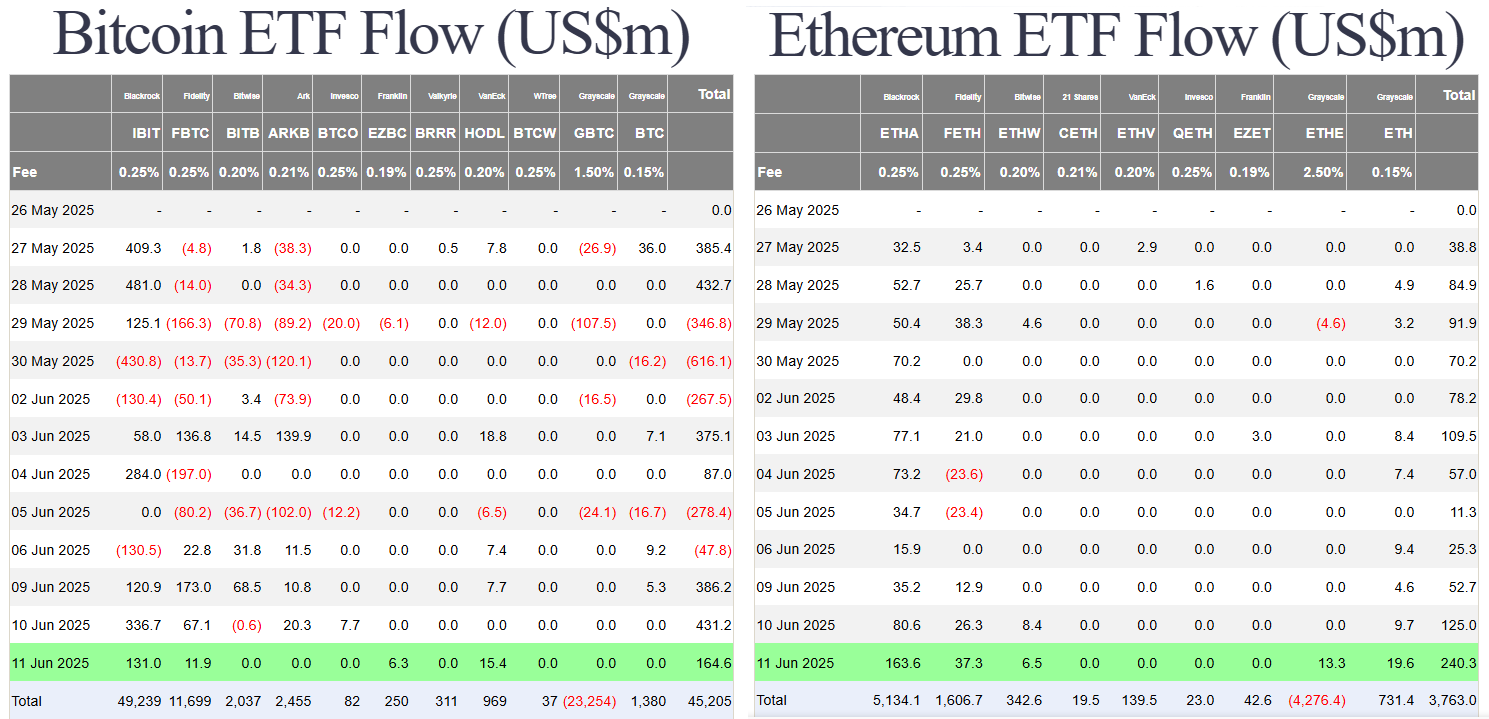 Các quỹ BTC spot ETF Hoa Kỳ thứ tư tiếp tục có dòng tiền vào dương 164.4 triệu USD. Còn ETH spot ETF bất ngờ có dòng tiền vào tăng đáng kể so với phiên trước đó với 240.3 triệu USD.