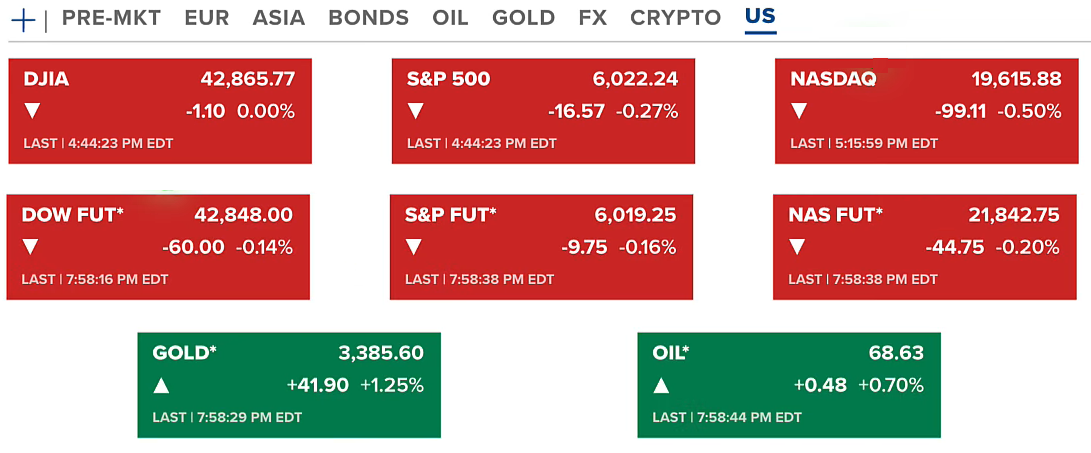 Chứng khoán Hoa Kỳ thứ tư (11/06) kết thúc với sự giảm nhẹ ở cả ba chỉ số, Nasdaq giảm nhiều nhất 0.5%. Hợp đồng tương lai của chứng khoán cũng tiếp tục giảm. Hợp đồng vàng tăng nhẹ lên 3385 USD/ounce. Dầu cũng tăng lên 68.6 USD/thùng.