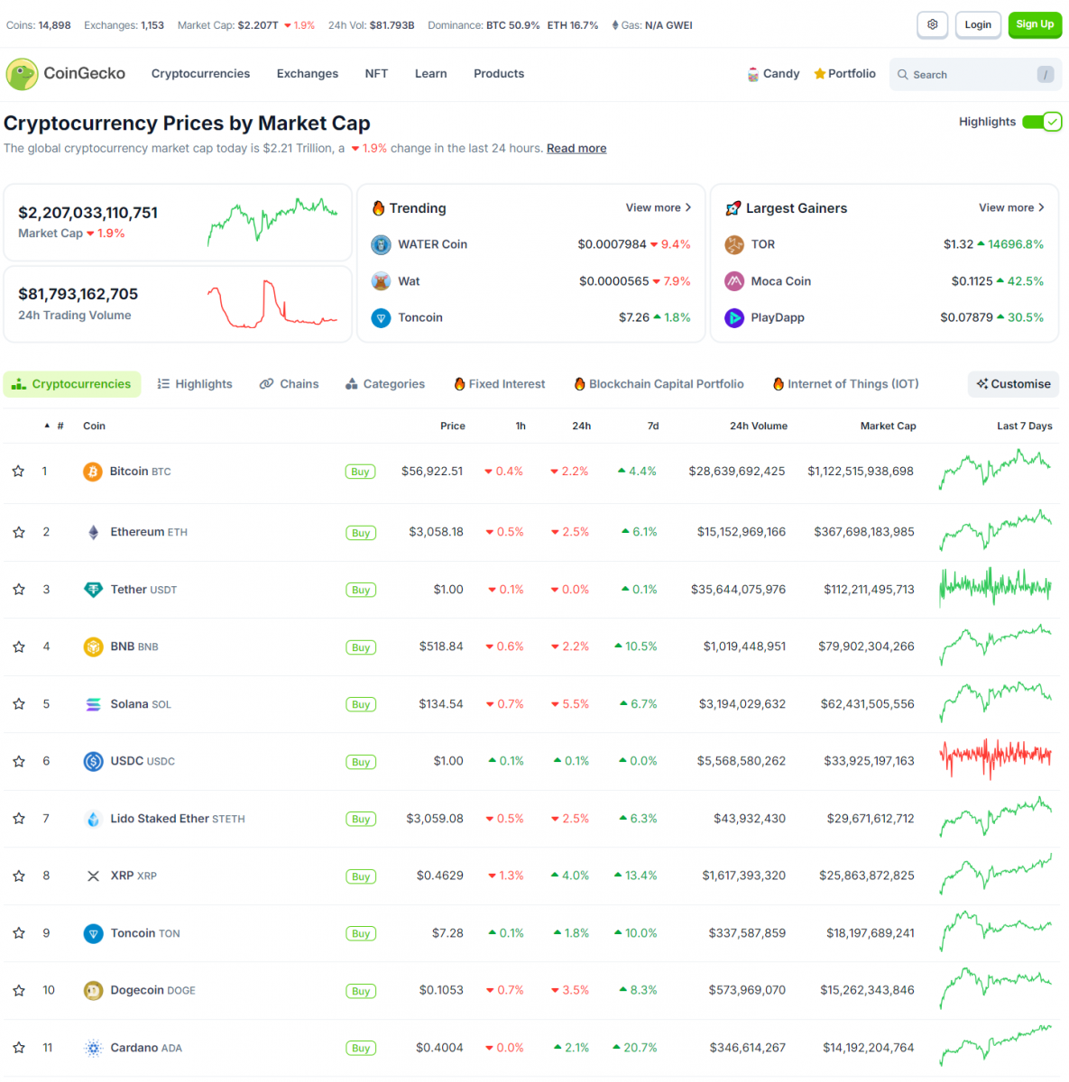 Còn Bitcoin đã tăng nhẹ nhưng sau đó trở lại bình thường. Giá BTC quanh mức 57,000 USD. Đa số altcoin điều chỉnh nhẹ. Vốn hóa thị trường crypto ở mức