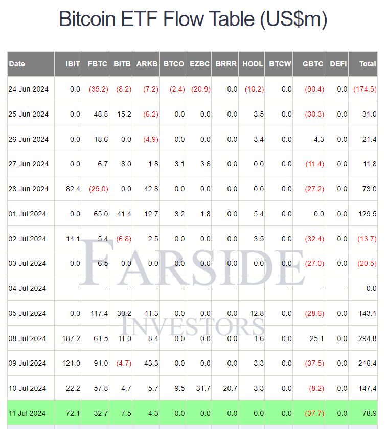 Các quỹ BTC spot ETF Hoa Kỳ tiếp tục thu mua BTC. Ngày thứ năm (11/07), các quỹ có dòng tiền vào dương 78.9 triệu USD.