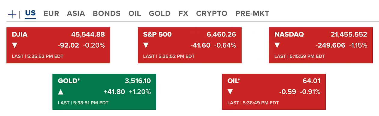Chứng khoán Hoa Kỳ ngày thứ sáu (29/08-US) giảm ở cả ba chỉ số, trong đó Nasdaq giảm nhiều nhất 1.15% nhưng phiên trước S&P 500 đã đạt đỉnh mới. Hợp đồng vàng tăng nhẹ lên 3516 USD/ounce. Dầu ở mức 64 USD/thùng. Vàng quanh 64 USD/ounce.