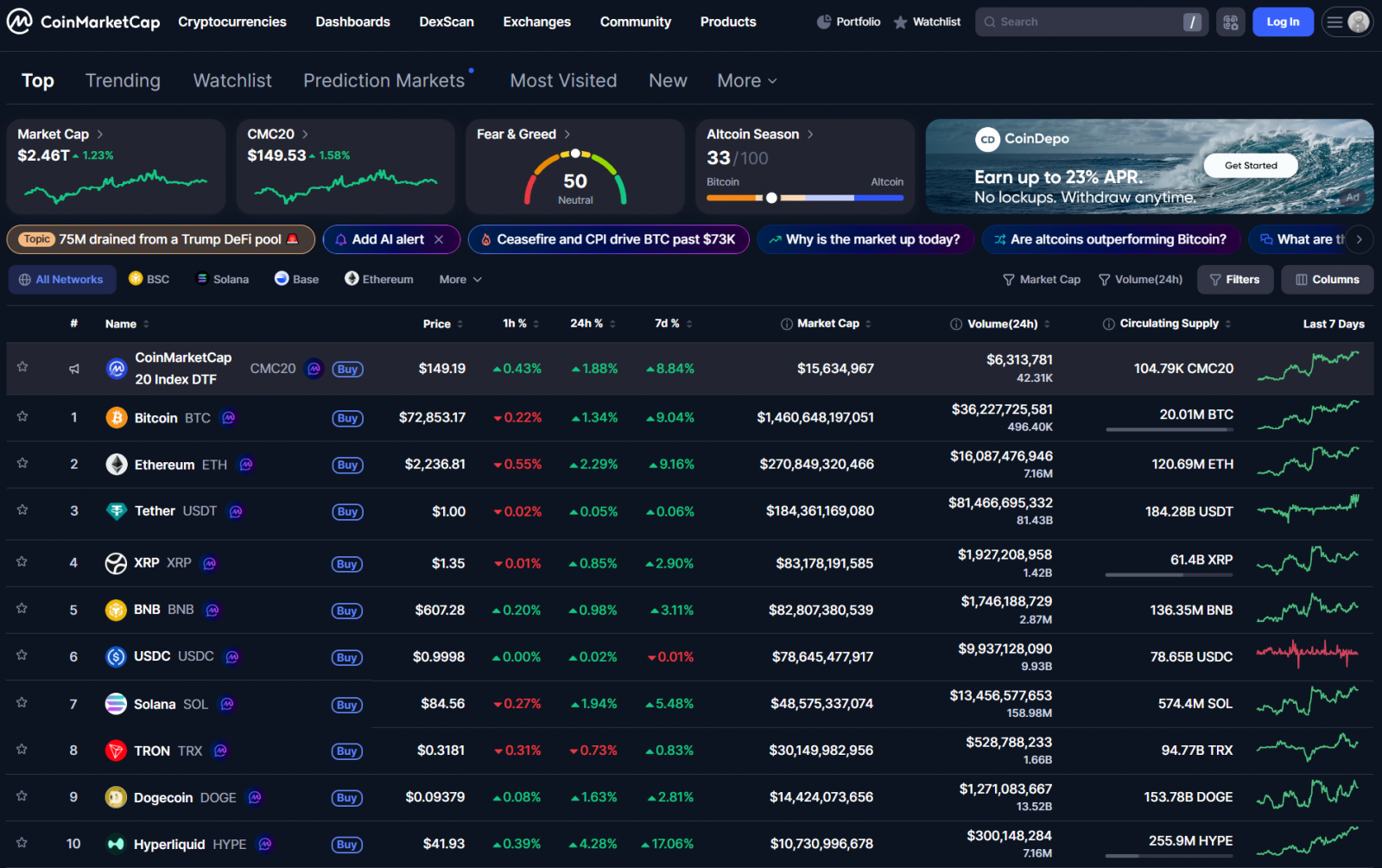 Bitcoin sau khi tăng lên trên 73,000 USD điều chỉnh về quanh 72,000 USD. Các altcoin lớn đồng loạt tăng theo. Vốn hóa thị trường crypto tăng nhẹ lên 2.46 nghìn tỷ USD.