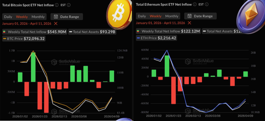 Dòng tiền spot ETF crypto tại Mỹ trong tuần 15/2026 tiếp tục ghi nhận xu hướng tích cực, với dòng vốn chủ yếu tập trung vào các tài sản vốn hóa lớn. Bitcoin ETF dẫn đầu với 545.9 triệu USD dòng tiền vào, đi kèm tổng khối lượng giao dịch đạt 93.29 tỷ USD. Ethereum ETF cũng ghi nhận 122.12 triệu USD dòng tiền vào, với 12.69 tỷ USD khối lượng giao dịch. Ở nhóm altcoin, XRP ETF thu hút thêm 11.75 triệu USD dòng tiền vào, với khối lượng đạt 968.15 triệu USD, trong khi SOL ETF ghi nhận dòng tiền rút ra 5.62 triệu USD, với tổng khối lượng giao dịch 827.71 triệu USD.