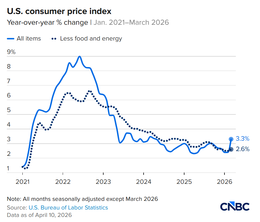 Thông tin kinh tế quan trọng nhất mà thị trường theo dõi hiện nay là dữ liệu lạm phát CPI tháng 3. Báo cáo cho thấy CPI ở mức 3.3%, tăng mạnh so với mức 2.4% của tháng trước. Đây là số liệu có tính cập nhật cao hơn so với PCE, do phản ánh trực tiếp diễn biến mới nhất trong tháng ba. Core CPI (không bao gồm năng lượng và thực phẩm) tăng lên 2.6%, thấp hơn dự báo 2.7%, nhưng vẫn cao hơn mức 2.5% trước đó, cho thấy áp lực lạm phát cơ bản vẫn tồn tại dù chưa quá nóng.
