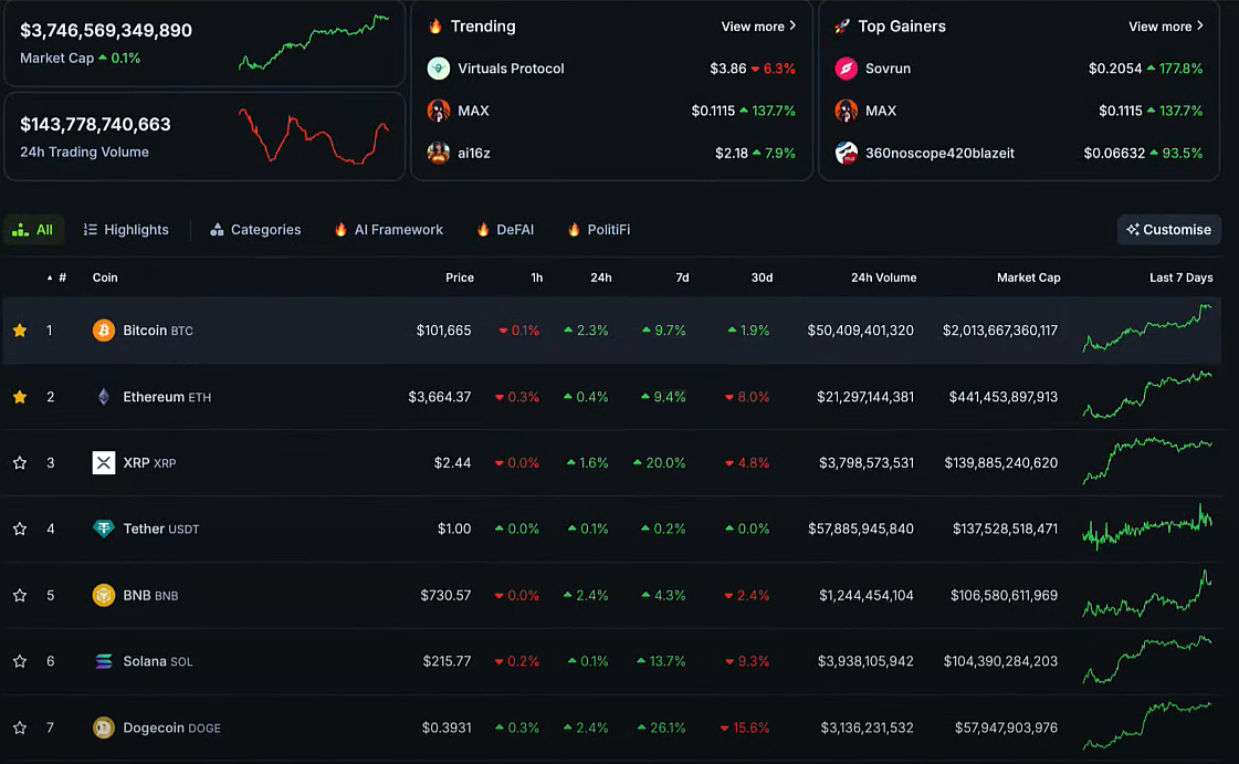 Bitcoin ngày qua đã tăng lên 101,000 USD. Các altcoin lớn và đa số các altcoin khác cũng tăng cùng xu hướng. Vốn hóa thị trường crypto tăng lên 3.74 nghìn tỷ USD.