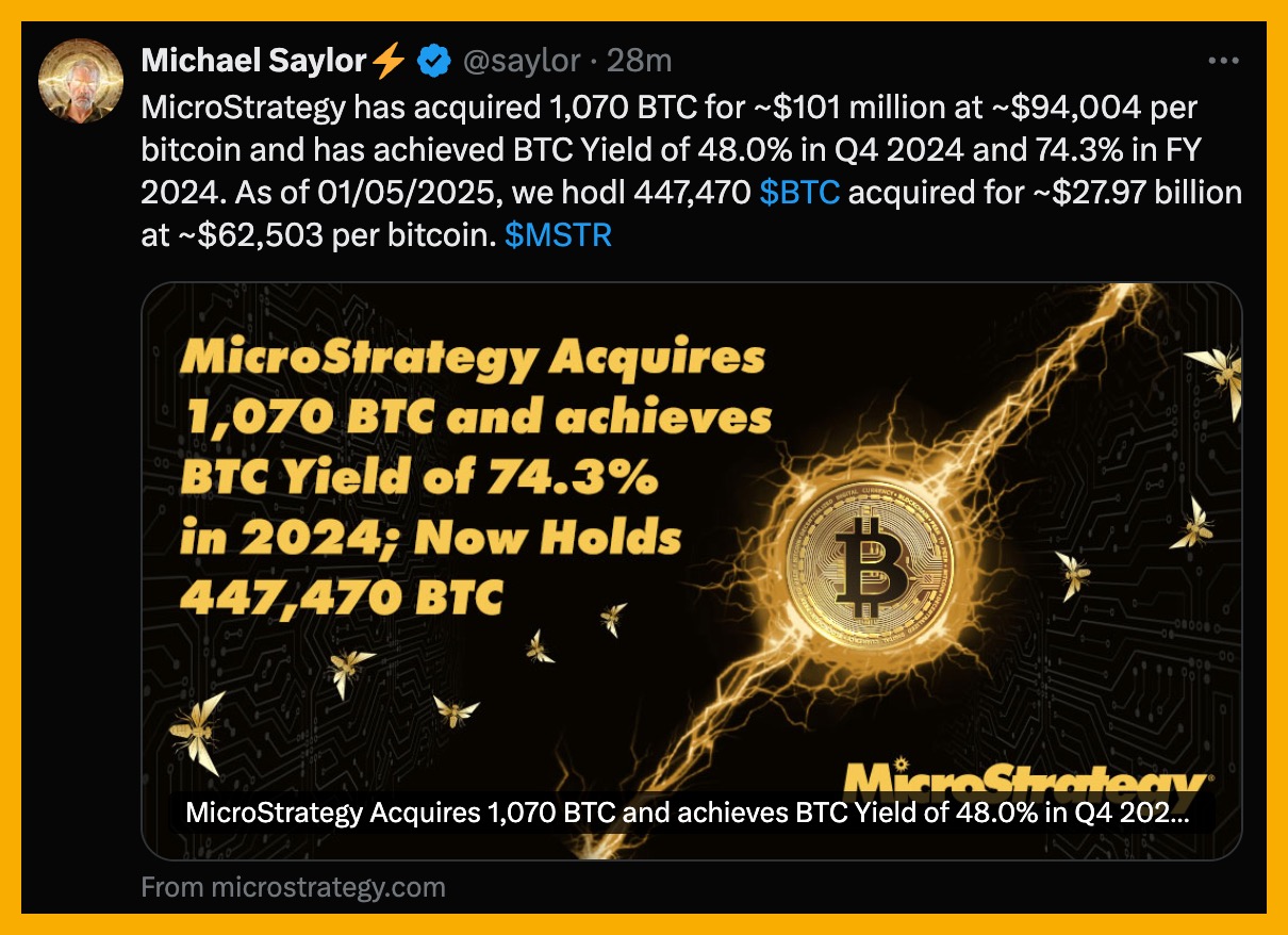 MicroStrategy, tổ chức nắm giữ Bitcoin lớn nhất thế giới, tiếp tục khẳng định cam kết của mình. Tính đến ngày 5/1/2025, công ty đã mua thêm 1,070 BTC với mức giá trung bình 94,004 USD, nâng tổng số Bitcoin nắm giữ lên 447,470 BTC với giá trung bình 62,503 USD mỗi đồng.