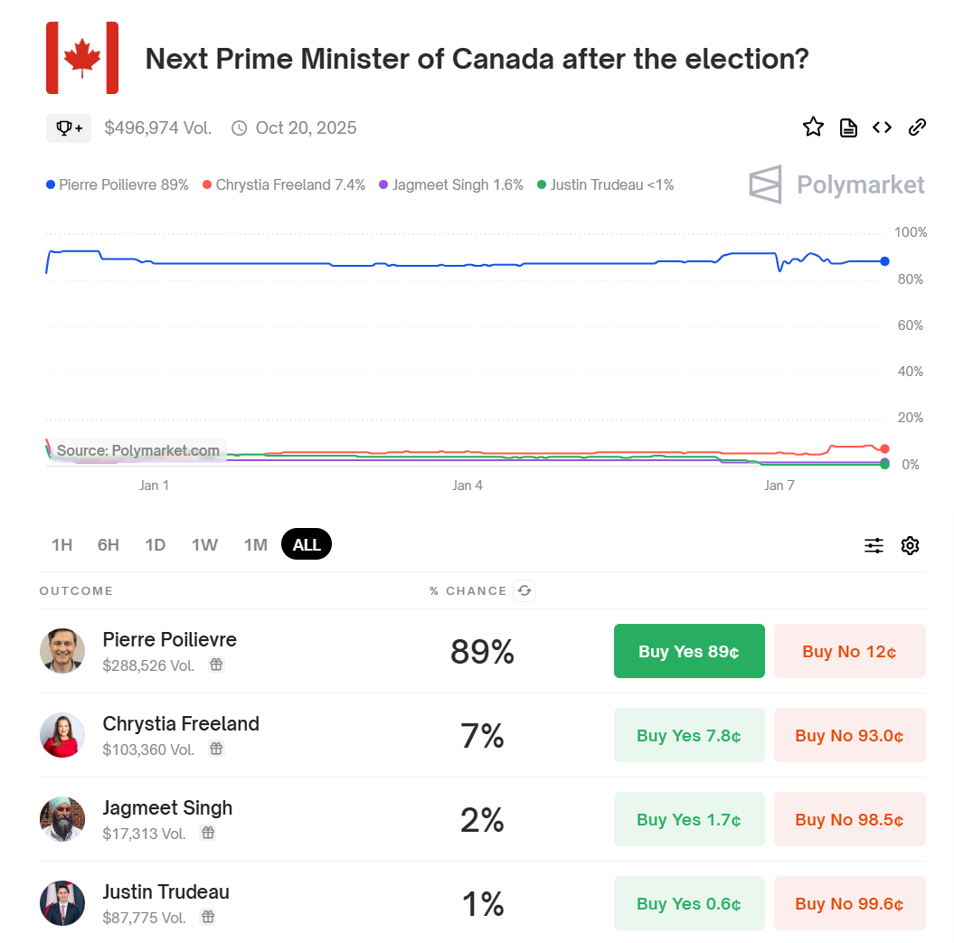 Sau khi Justin Trudeau từ chức, PolyMarket hiện đang nghiêng về Pierre Poilievre, lãnh đạo Đảng Bảo thủ Canada với tỷ lệ 90% trở thành Thủ tướng tiếp theo của Canada.