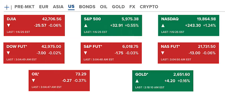 Chứng khoán Hoa Kỳ thứ hai (06/01 -US) kết thúc tăng ở hai chỉ số S&P 500 và Nasdqaq, Dow Jones giảm không đáng kể. Hợp đồng tương lai của chứng khoán nghiêng về xu hướng giảm. Hợp đồng dầu giảm nhẹ về 73.29 USD/thùng. Vàng tăng lên 2651 USD/ounce.