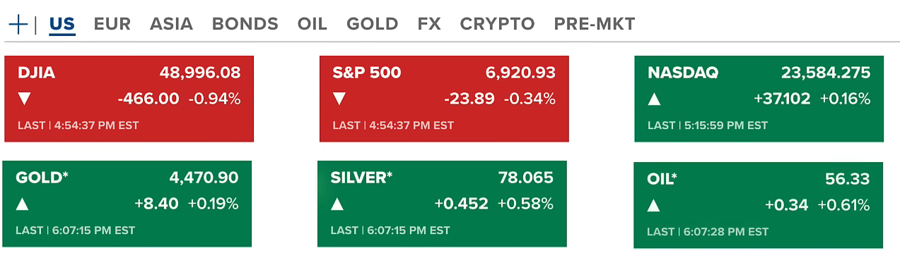 Chứng khoán Hoa Kỳ thứ tư (07/01/2026-US) có sự điều chỉnh nhẹ ở Dow Jones giảm 0.94% và S&P 500 giảm 0.34% sau khi đạt đỉnh mới ngày trước đó, còn Nasdaq tăng nhẹ 0.16%. Hợp đồng vàng và bạc tăng nhẹ quanh 4470 USD/ounce và 78 USD/ounce. Hầu hồi nhẹ nhưng vẫn ở mức thấp 56.33 USD/thùng.
