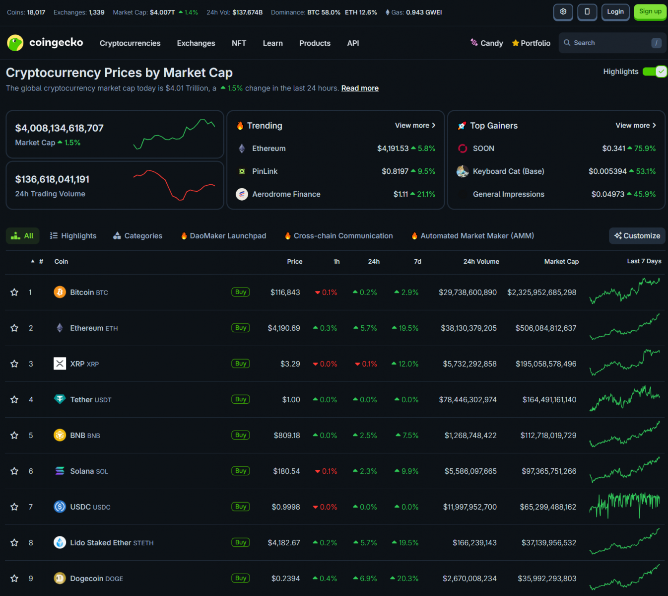 Bitcoin ngày qua vẫn giữ quanh 116,000 USD. Trong khi đó, nhiều altcoin trong đó có ETH đã tăng đáng kể. Vốn hóa thị trường crypto đạt 4 nghìn tỷ USD.