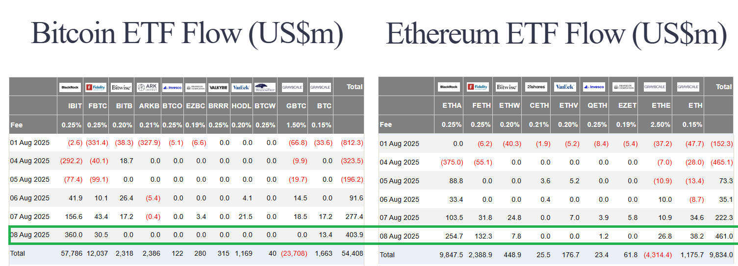 Các quỹ BTC spot ETF cũng có một ngày thứ sáu (08/08) có dòng tiền vào đáng kể với 403 triệu USD. Tương tự, ETH spot ETF cũng có dòng tiền vào lớn 461 triệu USD.